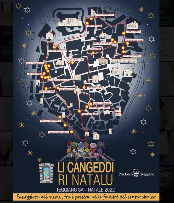 Teggiano natalizia e’ davvero affascinante. Il Borgo valdianese famoso per la manifestazione “Alla tavola della Principessa Costanza”, durante questi giorni di festa, diventa ancora piu’ accattivante. Numerose famiglie del centro storico hanno allestito nelle finestre o dietro le cosiddette “cangedde”dei piccoli presepi. Il percorso per vederli tutti e’ mostrato nella foto sotto.
