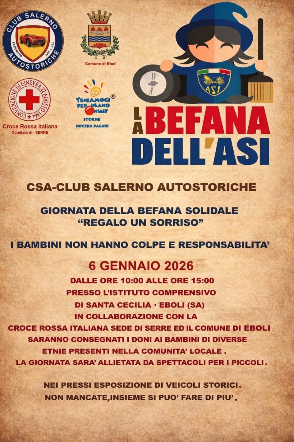 Domenica 11 gennaio anche a Salerno è arrivata la Befana dell’ASI, iniziativa del progetto ASI Solidale che ha portato doni, sorrisi e un messaggio di vicinanza ai più piccoli. Protagonista dell’evento il Club Salerno Autostoriche, da sempre impegnato in attività di solidarietà sul territorio.