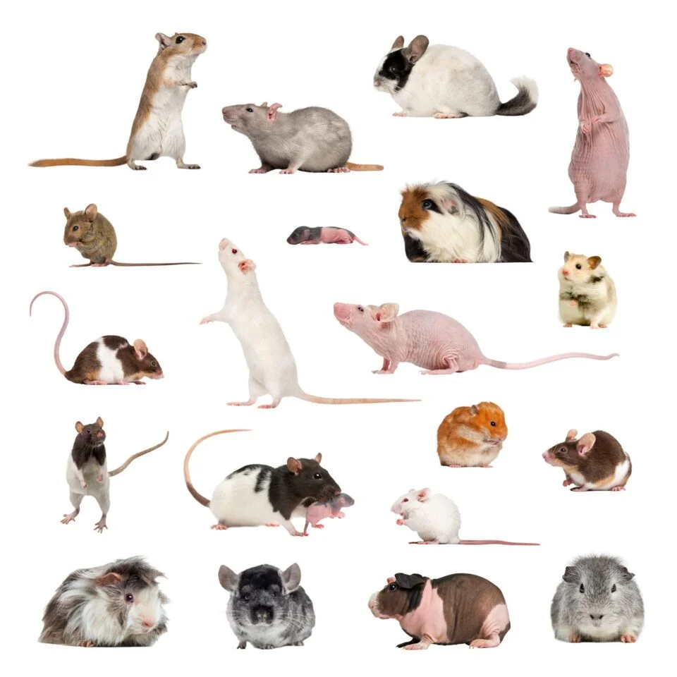 Ampia collezione di roditori, animali domestici ed esotici, in posizione diversa, isolati su sfondo bianco – Large collection of rodent, pet and exotic, in different position, Isolated on white background.