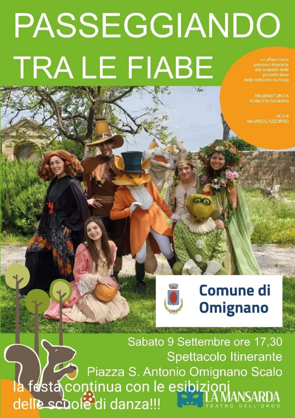 Ad Omignano Scalo, sabato 9 settembre 2023, in piazza Sant’Antonio, alle ore 17:30 si terrà lo spettacolo itinerante “Passeggiando tra le fiabe” con il quale si conclude l’attività dei laboratori del “Centro estivo” curata da “La Mansarda, teatro dell’orco” e svoltasi presso la Casa Bianca. Dopo lo spettacolo si terrà un’esibizione delle scuole di danza.