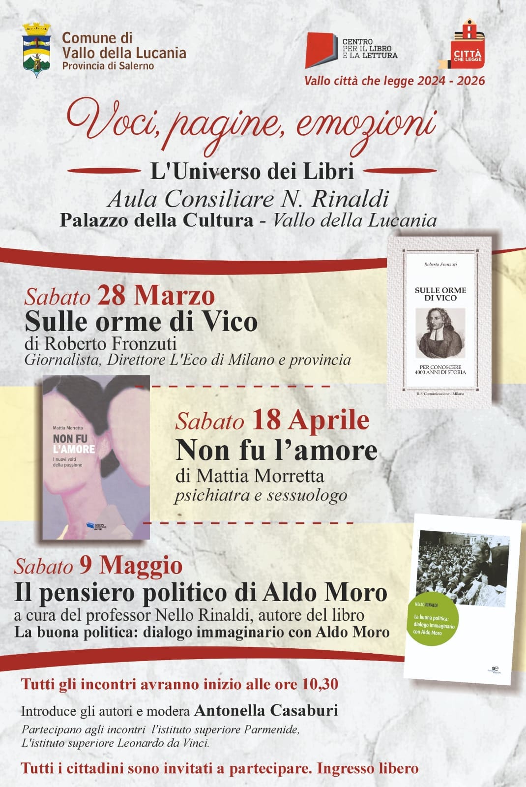 “La lettura è un diritto fondamentale e la Rassegna ‘Voci, pagine, emozioni’ del Comune di Vallo della Lucania non è solo un evento culturale ma uno strumento per rafforzare il legame tra istituzioni, cittadini, scuole”, sottolinea Antonella Casaburi, che introdurrà e modererà gli appuntamenti che avranno inizio nell’ Aula Consiliare di Vallo della Lucania, sabato 28 marzo alle ore 10:30 con “Sulle orme di Vico”, di Roberto Fronzuti.