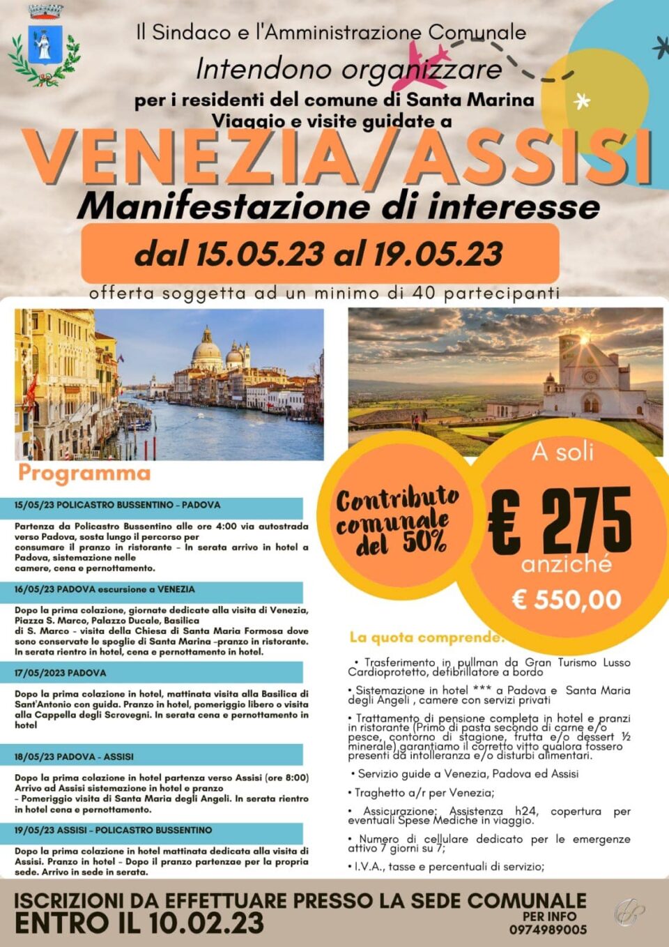 Il comune di Santa Marina organizza un viaggio a Venezia ed Assisi contribuendo nella misura del 50% alle spese. Tutti coloro che vorranno partecipare dovranno iscriversi presso il Comune entro il 10 febbraio.
