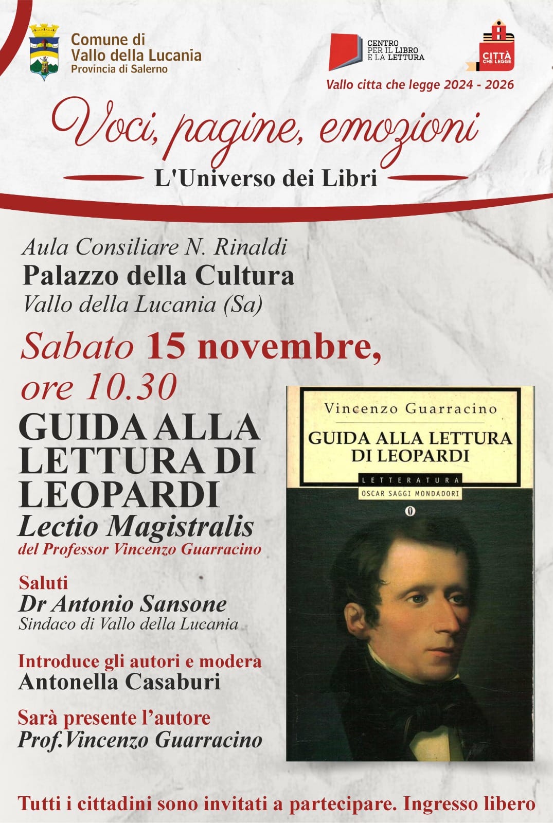 Sabato 15 ottobre, alle ore 10.30, presso l’ Aula Consiliare del Palazzo della Cultura di Vallo della Lucania, il Professor Vincenzo Guarracino terrà una Lectio Magistralis su Giacomo Leopardi.