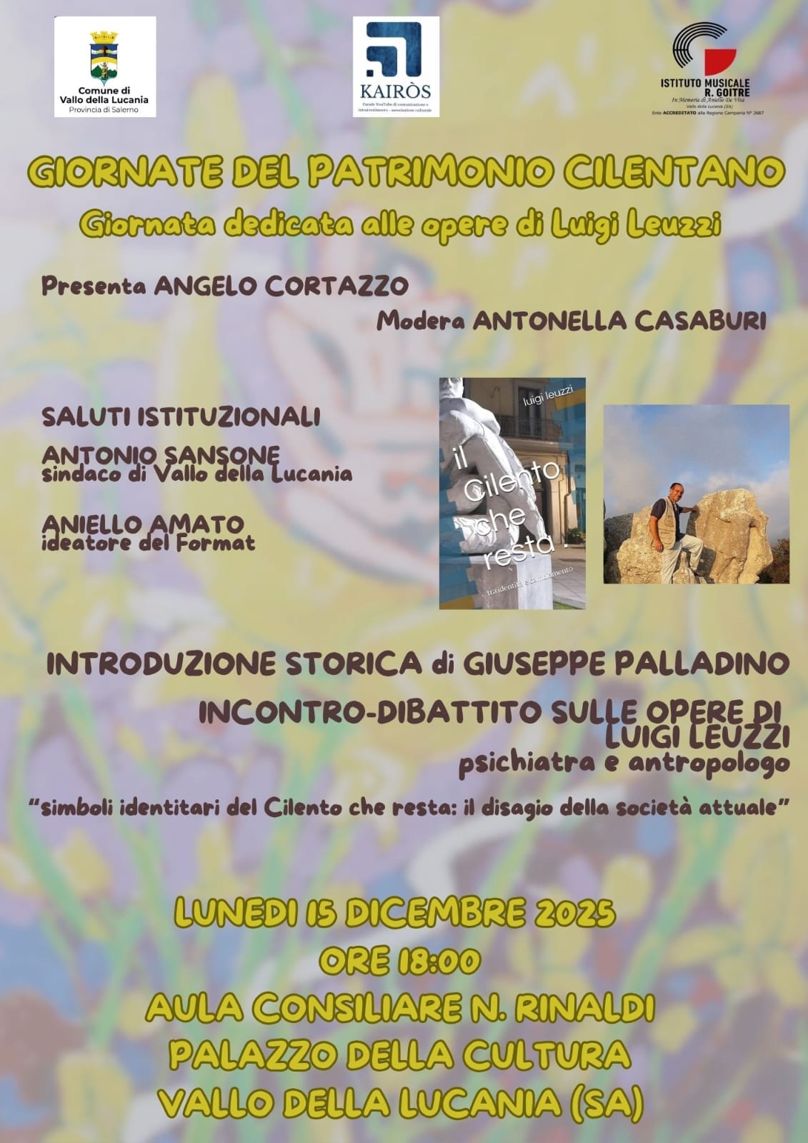 Lunedì 15 dicembre 2025, a partire dalle ore 18, le Giornate del Patrimonio Cilentano, ideate da Aniello Amato, faranno tappa a Vallo della Lucania, attraverso un incontro-dibattito sulle opere di Luigi Leuzzi, psichiatra e antropologo. Nella serata si discuterà dei simboli identitari del Cilento odierno, del narcisismo nella società attuale e dell’Empatismo, atteggiamento opposto e positivo, oltre che corrente letteraria e filosofica. L’evento si svolgerà nell’Aula Consiliare del Palazzo della Cultura e sarà caratterizzato da un’introduzione storica di Giuseppe Palladino e dal dialogo con il pubblico. Fra le ultime opere di Luigi Leuzzi, autore prolifico, si segnalano Il Cilento che resta e Narcisismo e società, su cui il dibattito si concentrerà maggiormente. La serata sarà condotta da Angelo Cortazzo e moderata dalla scrittrice Antonella Casaburi.